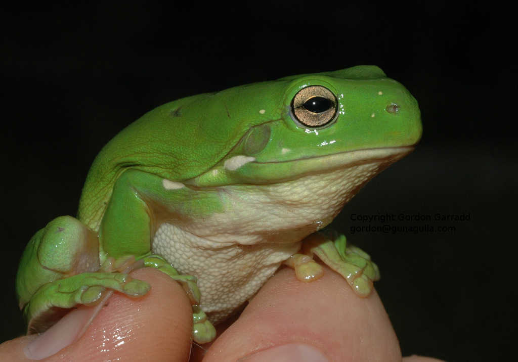 Green Tree Frog on celery in Growbed #3, strawberries in background