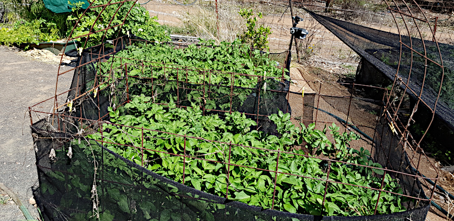 Several varieties of potatoes in the wicking beds, and in a bag of soil in a gravel grow bed in the background