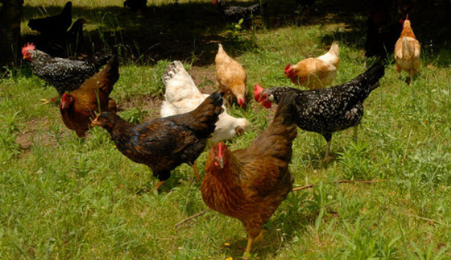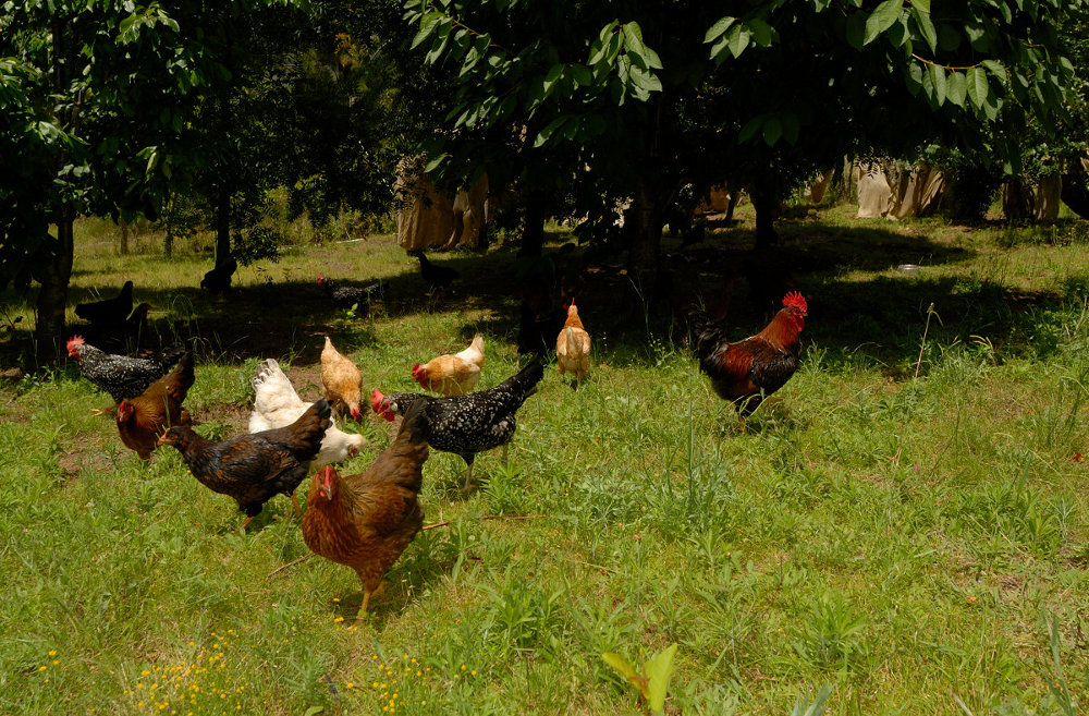 Chooks + Barney the Barnevelder rooster in the cherry orchard