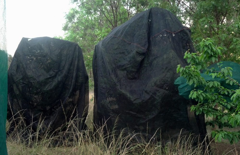 In the first year of the small system in hot weather, keeping the system water under ~22 degrees for the trout was quite a challenge. Lots of ice was added to the fish tank on hot days, up to 65kg on a hot day, and the sides of the grow beds and grow media were mostly shaded. King Parrots discovered the aquaponics vegetables on 6th Nov 2013, so I've had to enclose the greenhouse and outside growbed with netting to prevent any more attacks on the vegetables. Outside growbeds and wickbeds in the new system have netting over them to protect the vegetables from birds, including our chooks, who love chard.