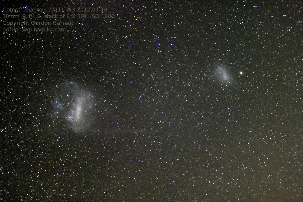 The Large and Small Magellanic Clouds, with a very faint Comet Lovejoy to the lower right of the LMC 12/1/2012
