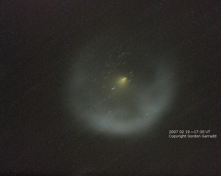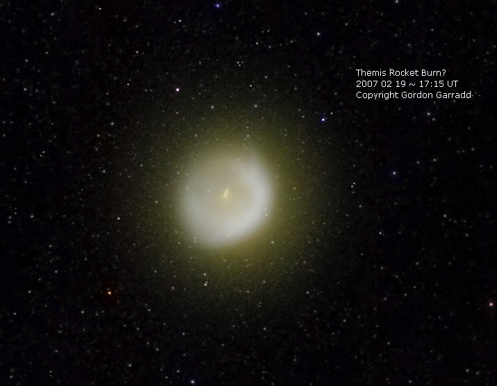 Initially thought to be related to the recent Themis launch, this object has been ID'd with the help of the US Air Force Space Surveillance System personel, and turns out to be an exploding Breeze-M rocket body. They later detected over 500 individual pieces on RADAR. The following day over 1100 peices were resolved by the RADAR. The image below is a median of several images of the rocket burn and a swarm of bits within it. A median was used to help cancel out the background star images, but differential motion of the individual pieces has blurred the ones furthest from the ones used for the manual image alignment.
